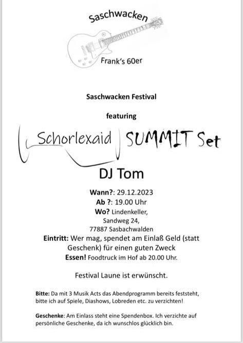 Die Band Schorlexaid macht Musik aus Spass an der Freude. Der Bandname "Schorlexaid" ist die dialektische Abwandlung von "Schorle gesagt". Entstanden ist der Name in der Skihütte "Ochsenstall" beim gemütlichen Beisammensein, als sich die Frage "Hat jemand Schorle gesagt ?" zum Synonym für die Bestellung der nächsten Runde manifestiert hat.